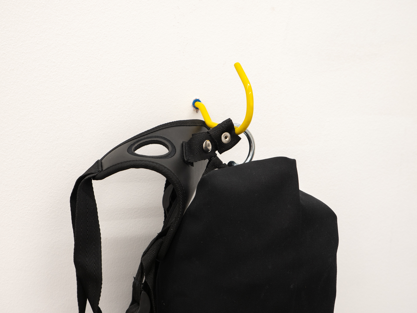 silicone rubber, polyurethane foam, synthetic hair, pant fabric, strap-on harness, hardware; 6” x 9” x 48”